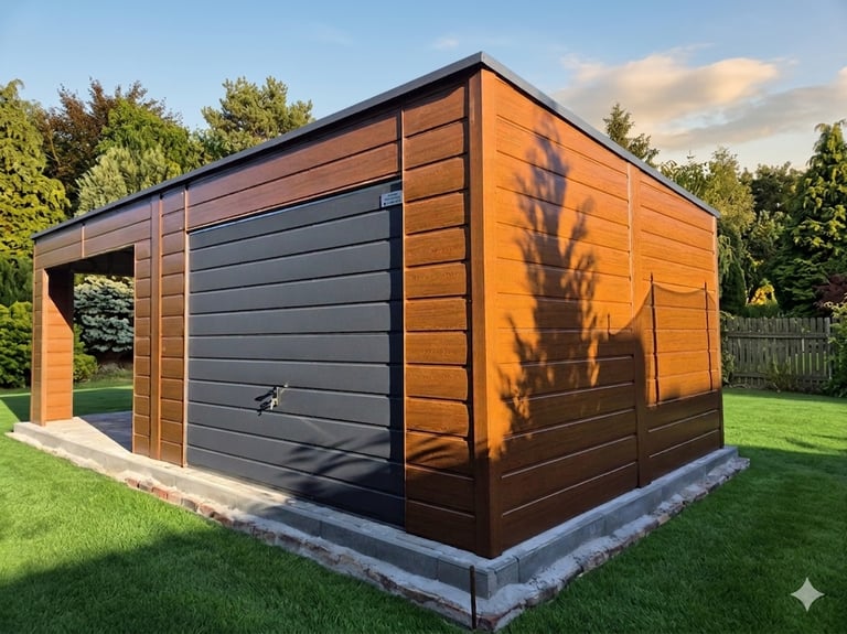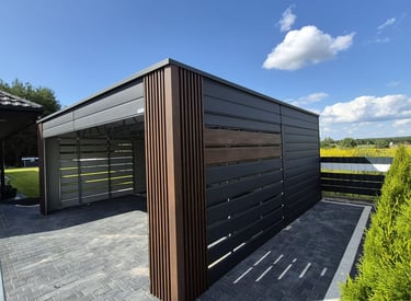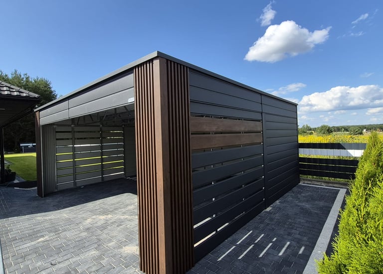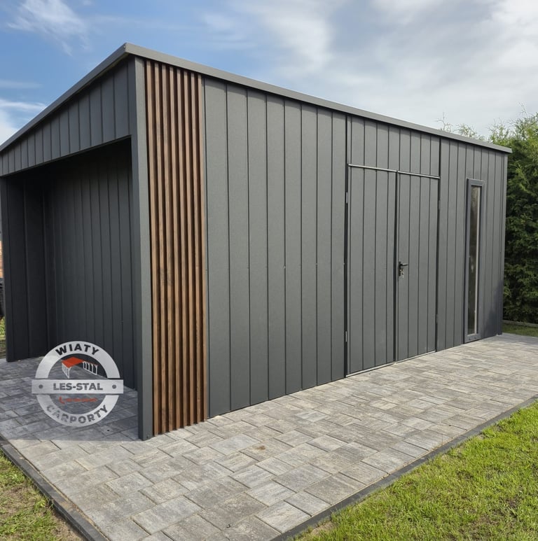 Stylowy garaż z naturalnych materiałów.